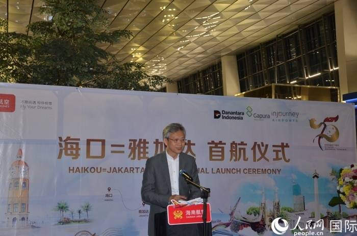 在苏加诺-哈达机场举办的首航暨接机仪式上,中国驻印尼大使王鲁彤致辞表示,在两国元首战略引领下,中国印尼关系健康稳定发展。人文交往是两国合作“五大支柱”中重要内容。中国是印尼的第三大客源地国家,印尼是中国游客海外旅游主要目的地国家之一。今天,正式开通海口至雅加达直航航线,再过几天,中国厦门航空还将开通杭州至雅加达直飞航线、增加重庆至雅加达的直航航班数量,这将给两国人文交往带来更多便利,也将进一步带动双方旅游和文化交流。