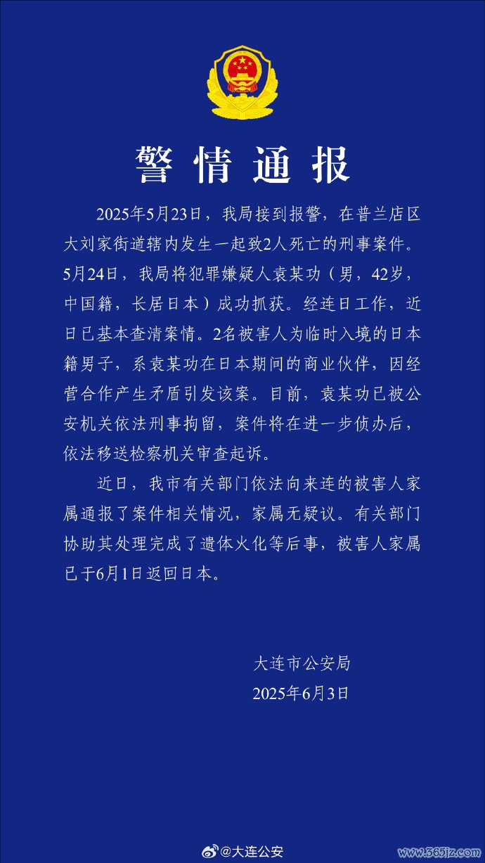 大连公安局6月3日通报,5月23日,大连市公安局接到报警,在普兰店区大刘家街道辖内发生一起致2人死亡的刑事案件。5月24日,大连公安局将犯罪嫌疑人袁某功(男,42岁,中国籍,长居日本)成功抓获。经连日工作汇发网,近日已基本查清案情。2名被害人为临时入境的日本籍男子,系袁某功在日本期间的商业伙伴,因经营合作产生矛盾引发该案。目前,袁某功已被公安机关依法刑事拘留,案件将在进一步侦办后,依法移送检察机关审查起诉。近日,大连市有关部门依法向来连的被害人家属通报了案件相关情况,家属无疑议。有关部门协助其处理完成了遗体火化等后事,被害人家属已于6月1日返回日本。